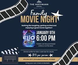 Join us for family movie night in the Mount Sopris Room. Tickets include kid friendly dinner buffet. Servers will be present to take adult orders from the restaurant menu.