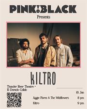 Pink to Black Presents: Kiltro ft. Aggie Flores & The Wildflowers Kiltro is a Chilean-American band from Denver, blending Latin folk, psychedelic rock, and ambient soundscapes. Founded by Chris Bowers Castillo, their music draws from his time in Valparaíso, Chile, fusing South American rhythms with dreamy textures. Their debut album, Creatures of Habit, earned critical acclaim. Known for hypnotic live shows, Kiltro creates immersive, cinematic sonic journeys. Friday January 16, 2026 $30 in advance, $35 at door.